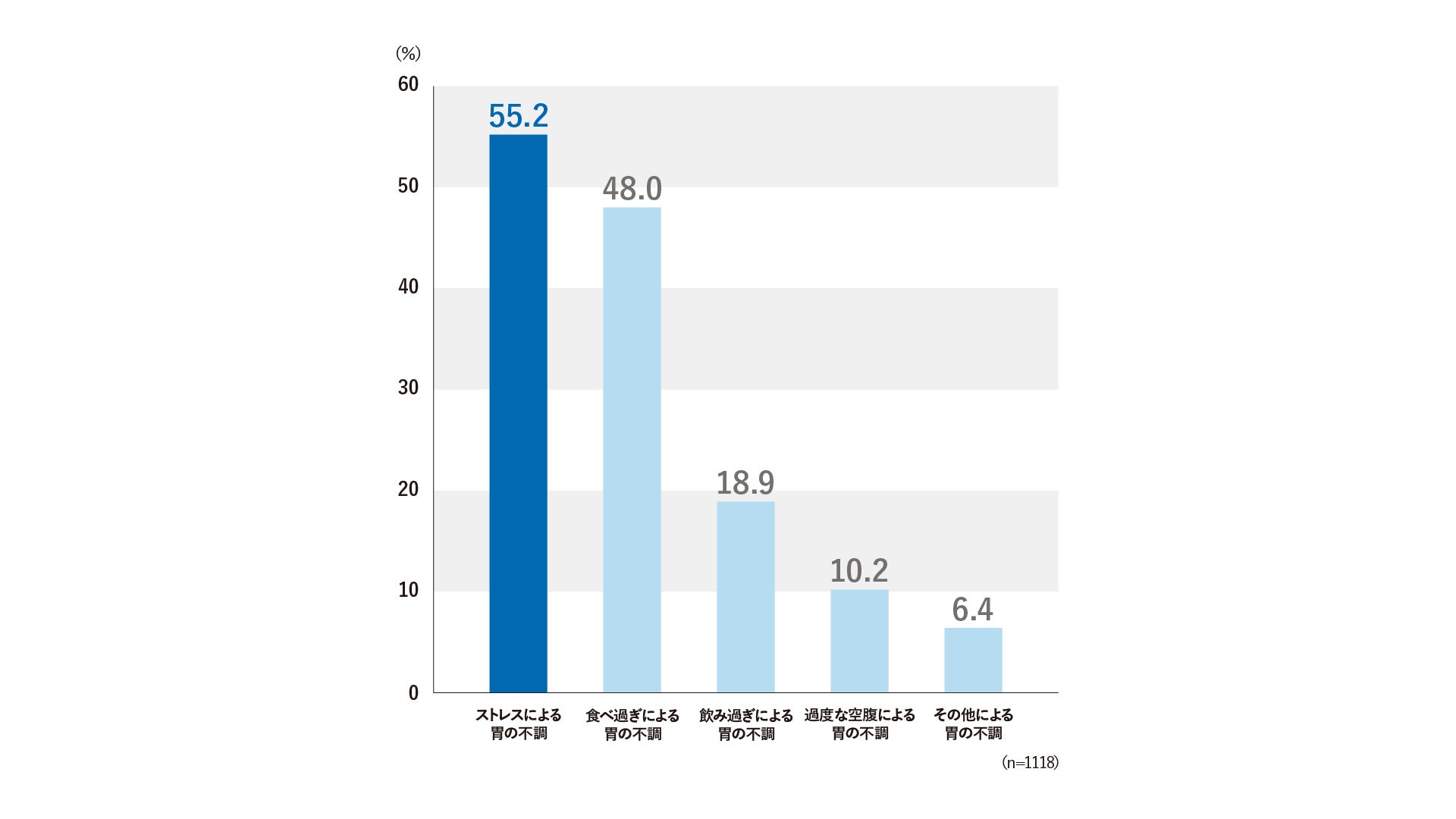 現在胃の不調を感じている原因として考えられるものについて聞くと、最も多かったのは「ストレス」で55.2%となりました。多くの人が胃の不調の原因の一つにストレスを挙げていることがわかりました。また、「食べ過ぎ」も48.0%と、多くの人が不調の原因の一つと回答していました。そのほか、「飲み過ぎ」18.9%、「過度な空腹」10.2%の順となっています。