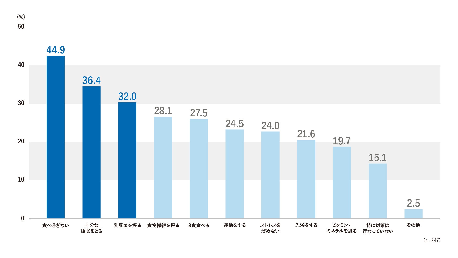 胃に負担を感じる生活になったと回答した人に、胃に負担がかからないよう、どのような対策を行っているのかを聞くと、TOP3は「食べ過ぎない」44.9%、「十分な睡眠をとる」36.4%、「乳酸菌をとる」32.0%の順となりました。生活習慣の改善に加えて、「乳酸菌をとる」ことが胃の負担対策として定着化しつつあることが伺えます。最近では、小型サイズのヨーグルトや乳酸菌飲料がコンビニなどで手軽に買えるようになり、いつでも乳酸菌が摂取しやすくなったことも背景にあると推察されます。