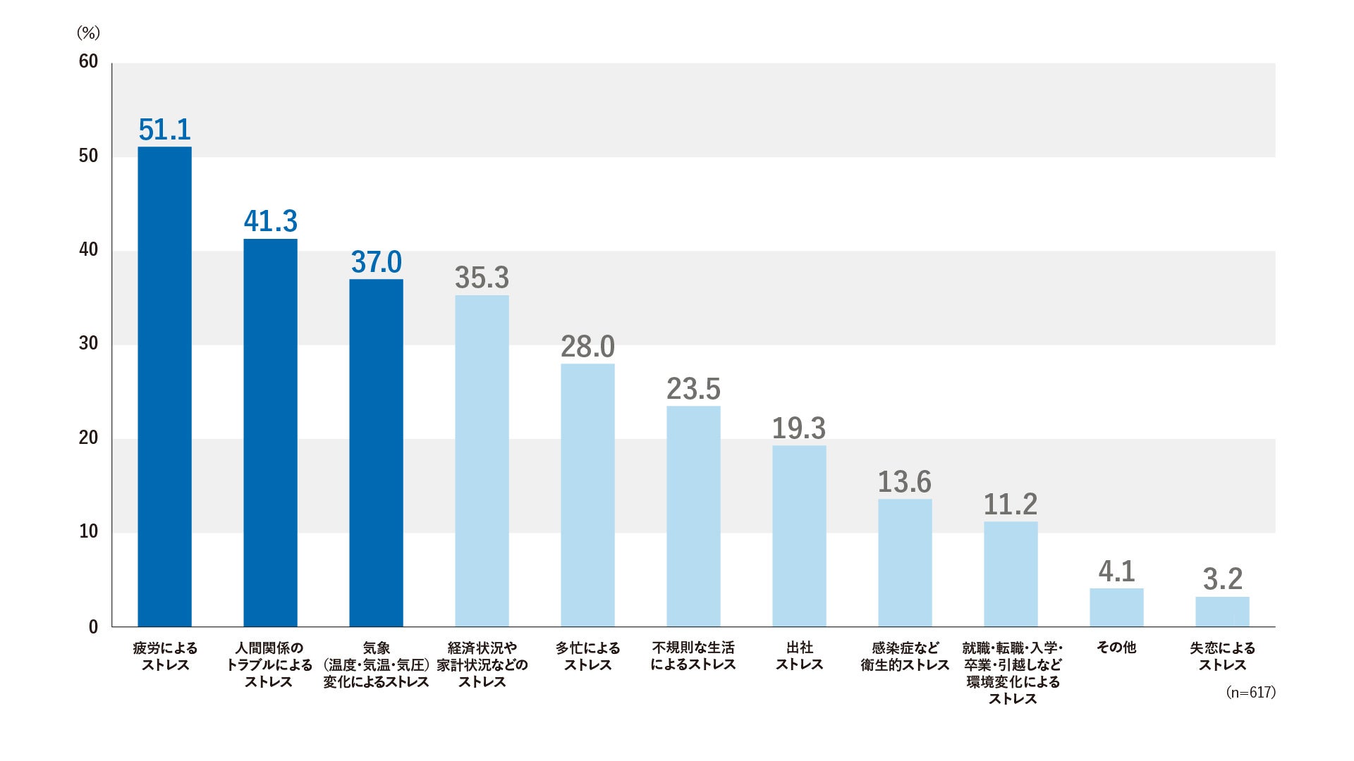 具体的なストレスは「疲労」「人間関係」「気象変化」を挙げる