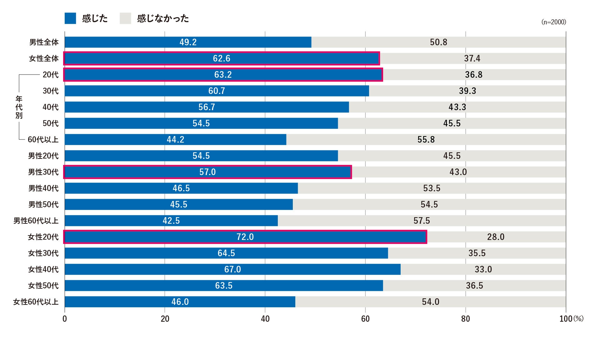 胃の不調を感じている人を男女別にみると、男性の49.2%に対して女性は62.6%と、女性の割合がさらに上昇し、今年は6割を超えました。年代別では、20代63.2%、30代60.7%、40代56.7%、50代54.5%、60代以上44.2%となりました。20~30代で、胃の不調を感じる人の割合が6割を上回っており、前年から引き続き、若い世代ほど胃の不調を訴える傾向にあるようです。特に今回は、女性20代の割合が72.0%と、過去最高値を記録しており、性年代別で最も胃の不調を感じていることが明らかになりました。