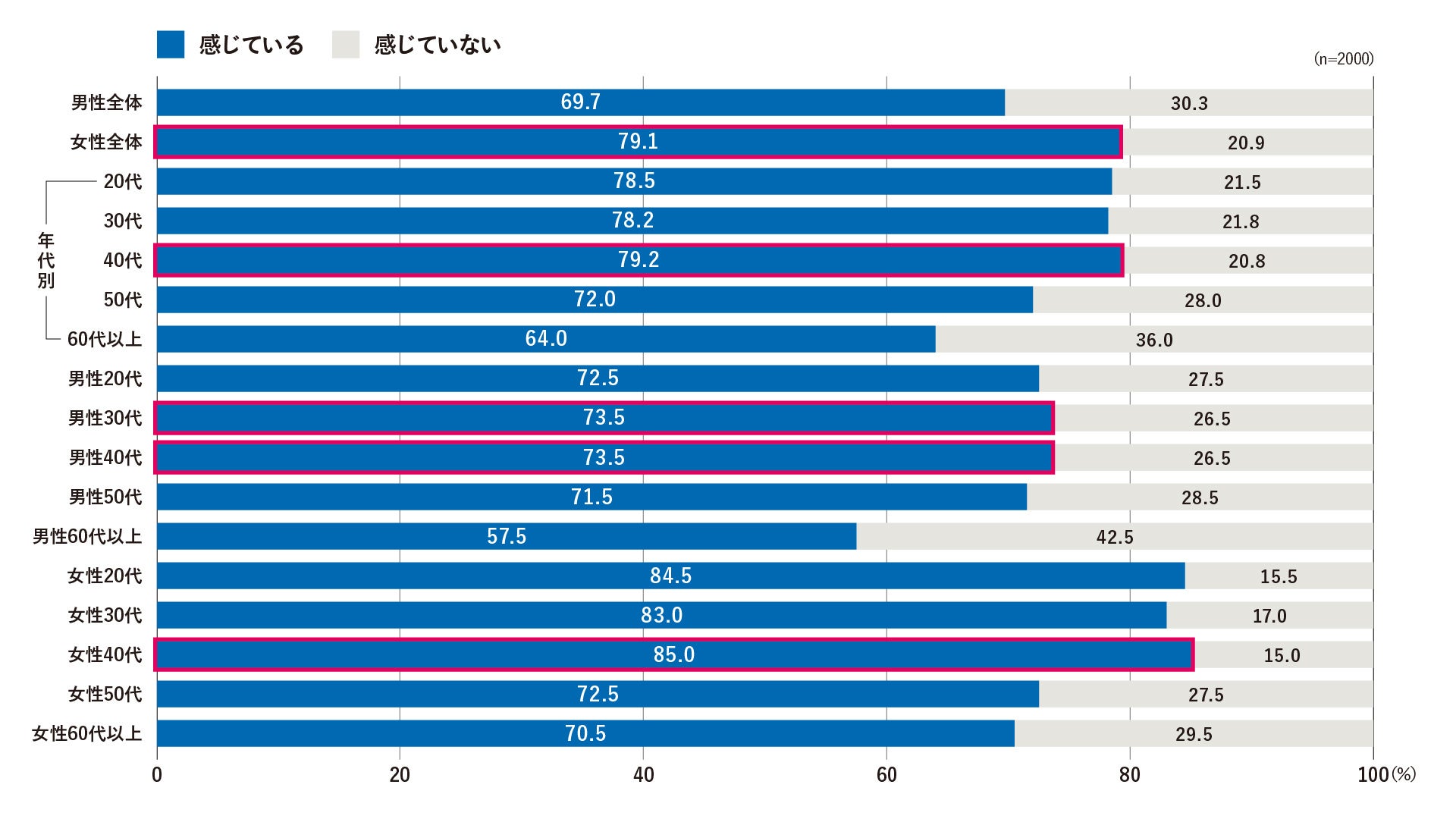 調査ではまず、現在どの程度ストレスを感じているのかを聞いたところ、「とても感じている」が17.9%、「感じている」が24.5%、「やや感じている」が32.0%となり、合わせて74.4%の人が「ストレスを感じている」と回答しました。7割を超える人が日々の生活の中でストレスを抱えていることが明らかになりました。ストレスを感じている人を年代別にみると、40代の割合が最も高く79.2%となりました。男女別では、男性の69.7%に対して女性は79.1%と、女性の割合が約10ポイントも高く、特に女性40代は性年代別で最高値となる85.0%に達しました。女性40代は更年期症状が出始める時期でもあるといわれていることから、更年期によるストレスの可能性も考えられます。