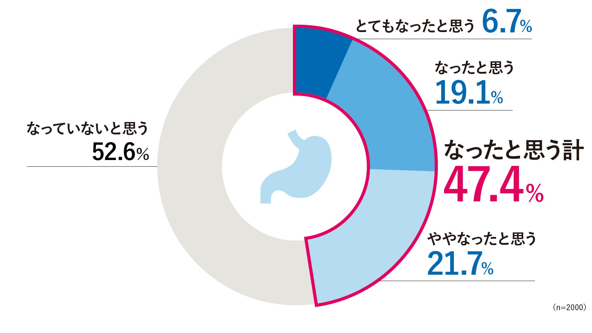 今年に入って、胃に負担を感じる生活になったかを聞いてみると、半数近い47.4%の人が「なったと思う」(「とてもなったと思う」6.7%+「なったと思う」19.1%+「ややなったと思う」21.7%)(※)と回答しました。今年は、アフターコロナにともなう生活環境の変化や、記録的な猛暑、頻発する自然災害、値上げラッシュによる家計の不安、長引くウクライナ情勢やパレスチナ自治区ガザ地区における武力衝突への不安などの影響で、胃に負担を感じるようになった人も多いと思われます。