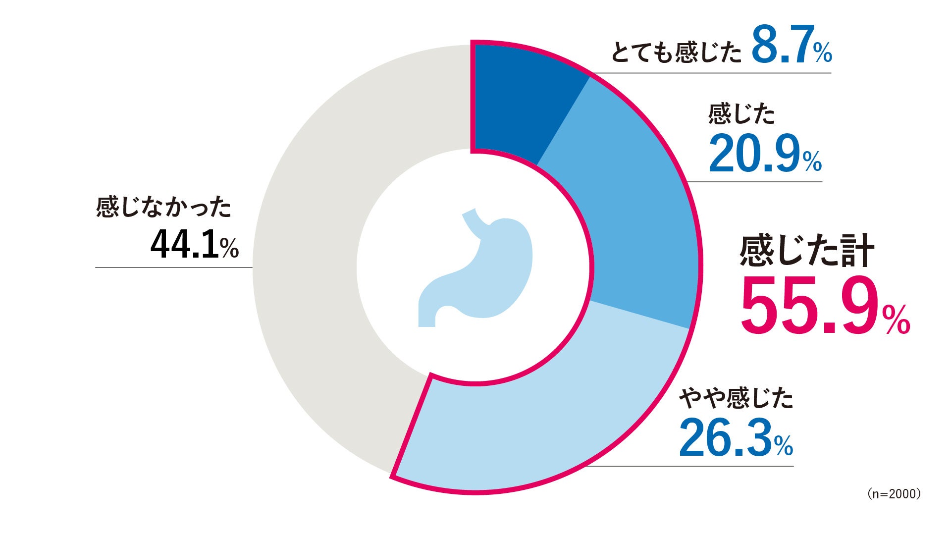 コロナ禍の在宅生活の影響により、胃の不調を抱える人の割合や症状の程度、
