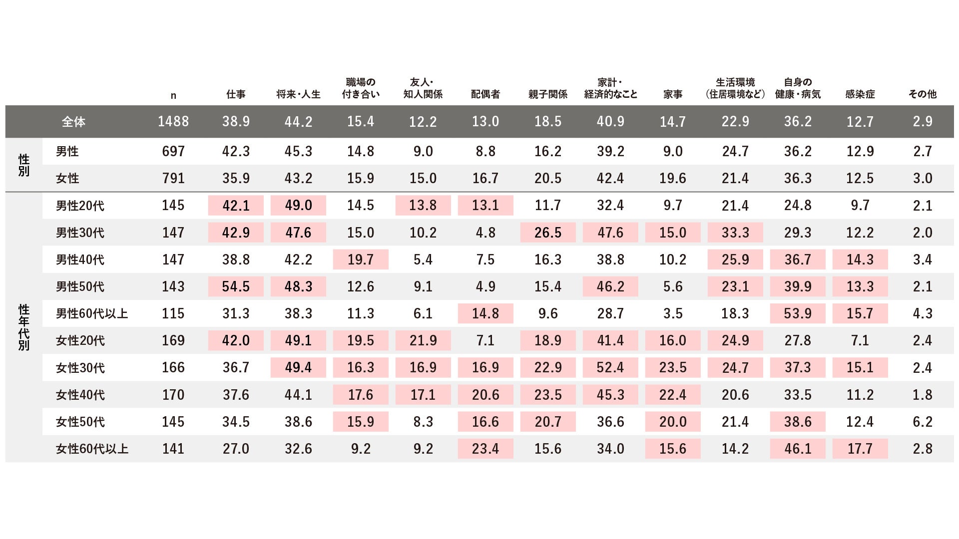 現在ストレスを感じていると回答した人に、その原因について聞いてみると、TOP3は「将来・人生」(44.2%)、「家計・経済的なこと」(40.9%)、「仕事」(31.9%)の順となりました。また、この結果を性年代別でクロス集計し、各世代で全体平均を上回る数値を抽出したところ、世代によって抱えているストレス原因に差があることが浮き彫りになりました。注目ポイントとして、20代では「将来への不安や対人関係」、30代では「暮らしや家計・経済的な不安」が大きなストレス原因になっていることが伺えます。40~50代をみると、男性では「職場の人間関係への不安や、職責・仕事に対するプレッシャー、将来への不安」と仕事関連のストレスを感じている一方で、女性では「家事・夫婦・親子関係」と家庭内のストレスを抱える傾向にあり、男女でストレス原因に明確な差が出ました。60代以上では、「一緒に暮らしている配偶者と自身の健康不安」がストレス原因になっていることが示唆されました。このように世代別でストレス原因が多様化している背景には、SNSの普及による対人関係の変化、アフターコロナにともなう職場や学校の現場回帰、急激な物価高騰、ジェンダーレス化の進展、老々介護など、昨今の世相も影響を及ぼしているものと考えられます。