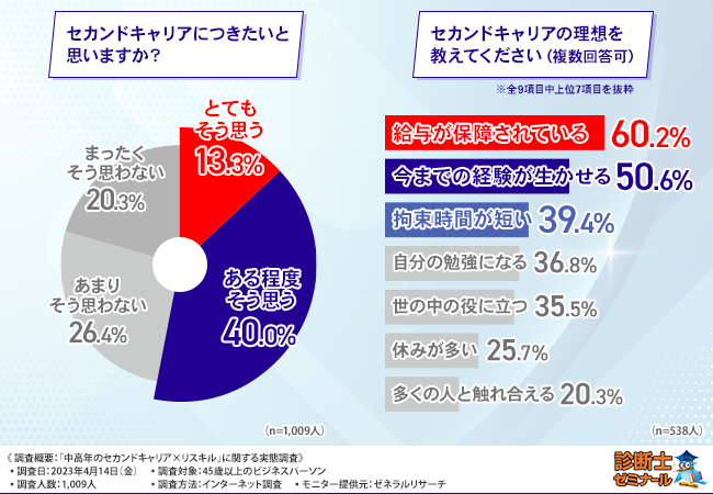中小企業診断士合格講座『診断士ゼミナール』を運営する株式会社レボ(本社所在地:東京都港区、代表取締役:松永 慎也)は、45歳以上のビジネスパーソンを対象に「中高年のセカンドキャリア×リスキル」に関する調査を実施しました。
