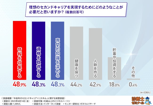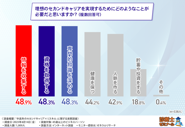 「理想のセカンドキャリアを実現するためにどのようなことが必要だと思いますか?(複数回答可)」と質問したところ、『情報を収集する(48.9%)』と回答した方が最も多く、次いで『資格を取得する(48.3%)』『専門的知識を深める(48.3%)』『健康を保つ(44.2%)』『人脈を作る(42.9%)』と続きました。