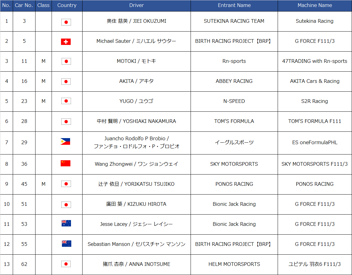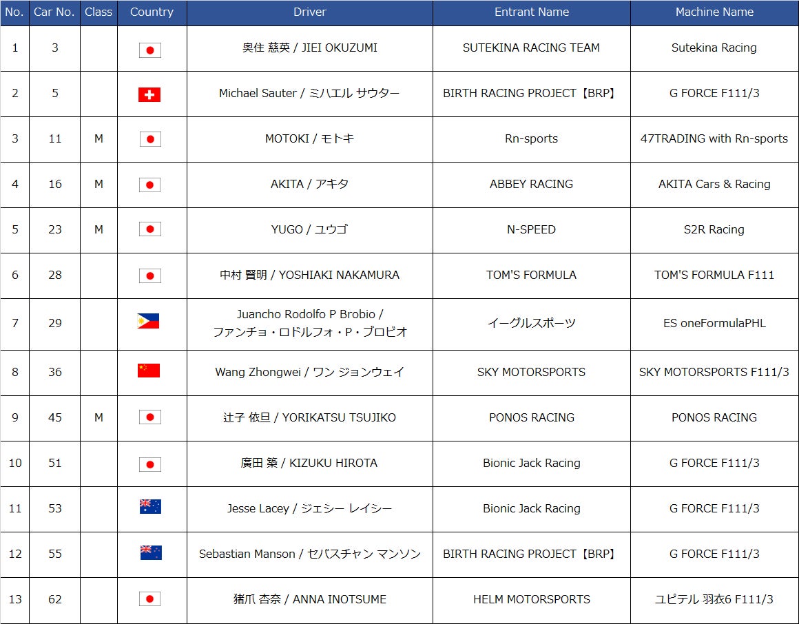 【2024年開幕戦 鈴鹿大会(レース1~3)エントリーリスト】