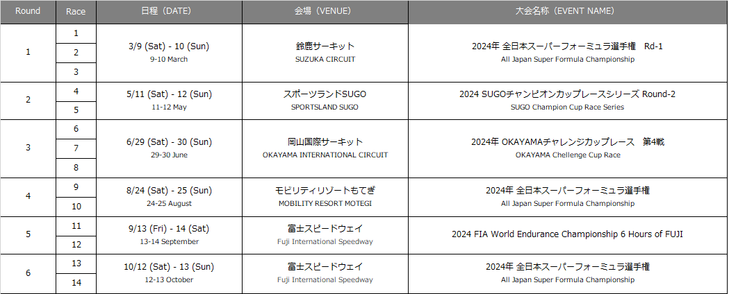 今季のFRJは、開幕戦を含む3大会が全⽇本スーパーフォーミュラ選⼿権と併催、5大会目は2024 FIA World Endurance Championship 6 Hoursと併催、他2大会を含む、6大会14レースを予定しています。