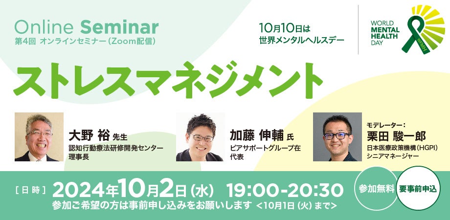 日本医療政策機構(HGPI)(事務局:東京都千代田区、代表理事:乗竹亮治)、株式会社ベータトリップ(本社:東京都目黒区、代表:林晋吾)、ルンドベック・ジャパン株式会社(本社:東京都港区、代表取締役社長:ルネ・アイラ・アンデルセン)は、10月10日の『世界メンタルヘルスデー』の啓発活動の一環として、「ストレスマネジメント」をテーマに、オンラインセミナーを10月2日(水)に開催します。当事者の方やご家族はもちろん、メンタルヘルスに関心をお持ちの方、どなたでもご参加いただけます。