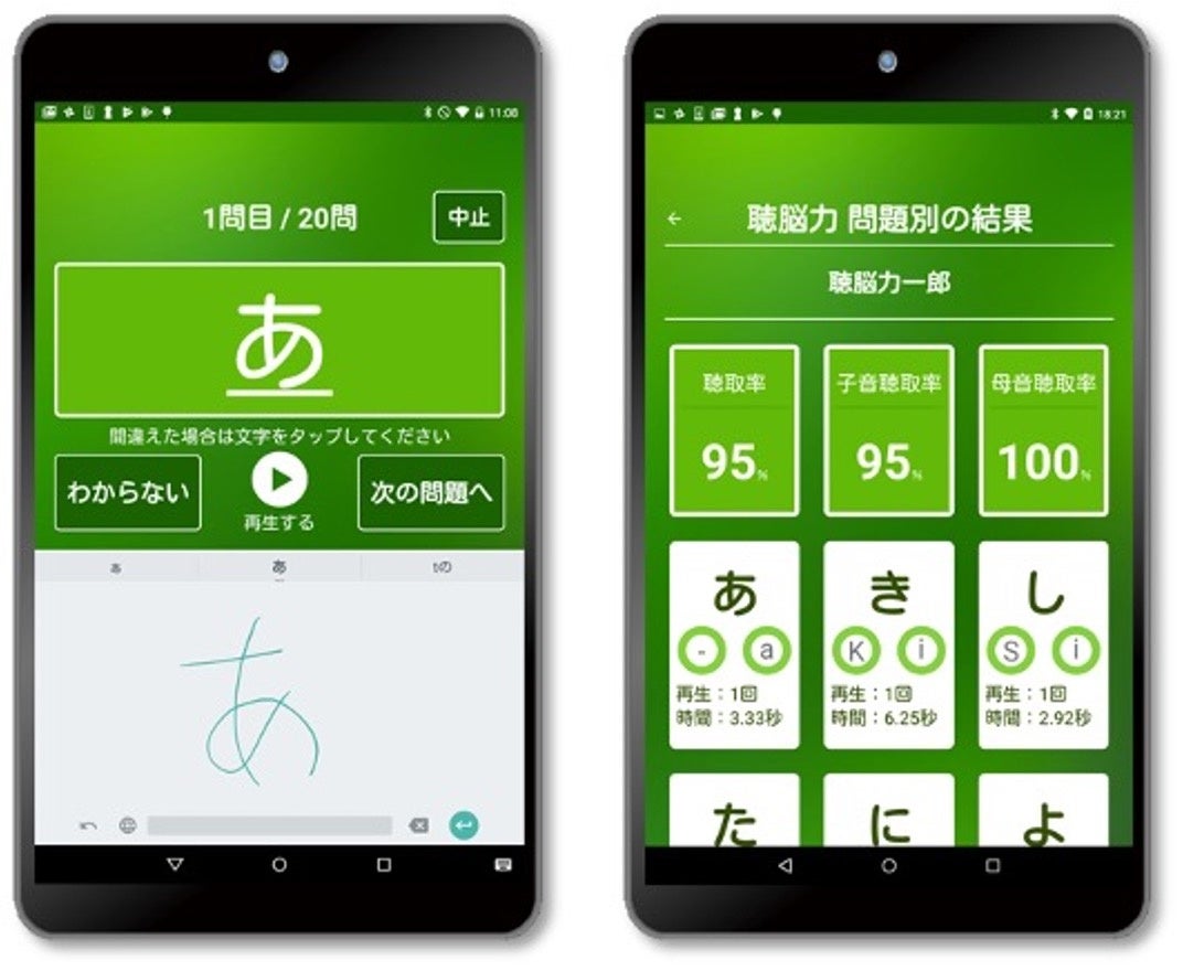 語音の聞き取りクイズで誰でも簡単に「聴きとる脳力」の状態がチェックできるアプリです。タブレット端末を使用し、音声で流れる単音の言葉をクイズ形式で答える3分程度のゲームにチャレンジ。結果は100点満点で表示され、母音、子音の聞き取りの状態を「聴取率」として結果表示し、回答への反応速度や聞き直しなどの回数もわかるなど、総合的に「聴きとる脳の力」の状態を把握できます。結果は保存され、「聴きとる脳の力」の状態を定期的にチェックすることが可能です。