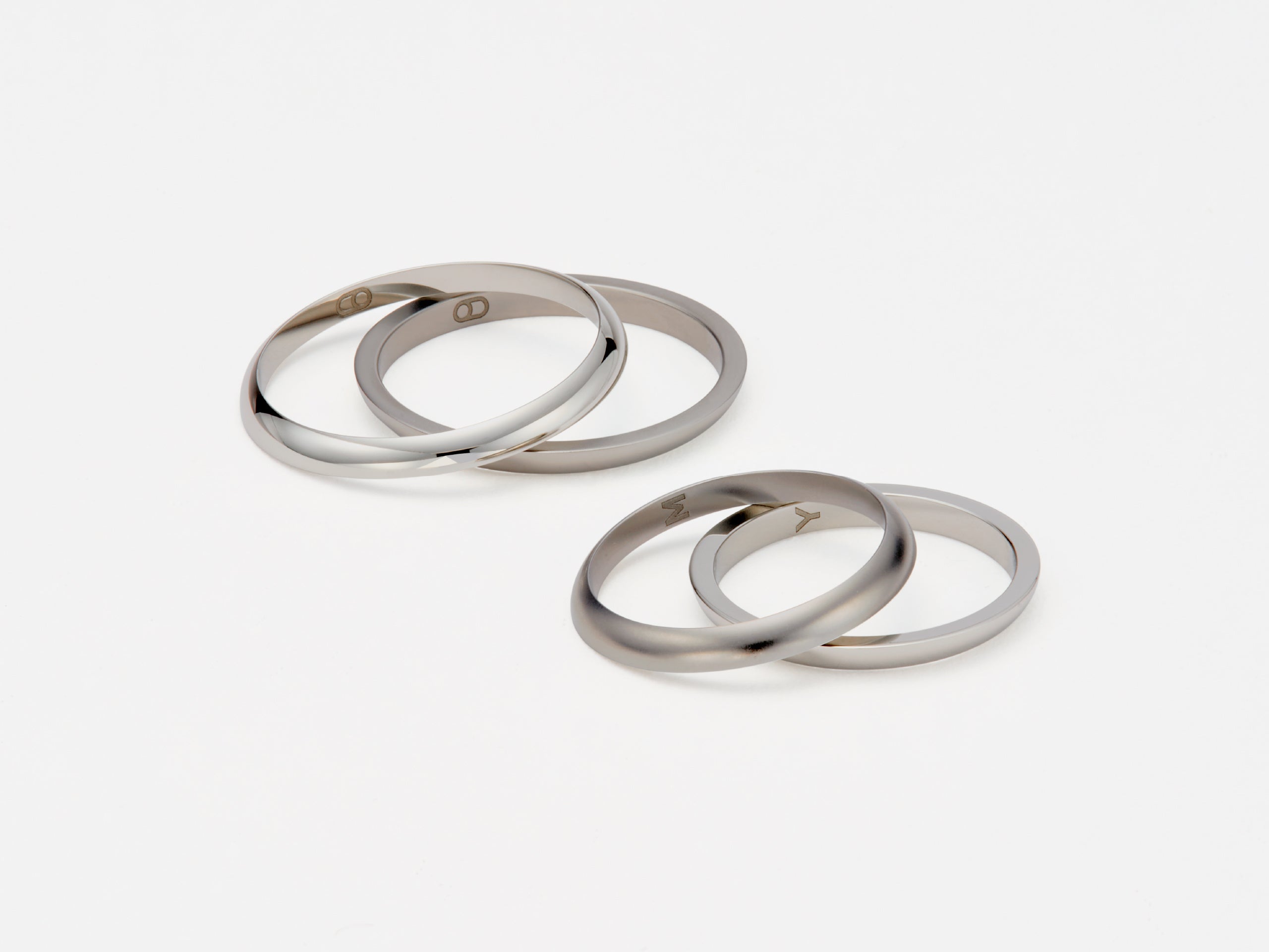 ダブルチタンは、異なる質感の指輪を重ね合わせること で完成する CONNECT です。輝く指輪は少しずつ曇り、曇った指輪は少しずつ輝いていきます。輝きは曇りに、曇りは輝きに。