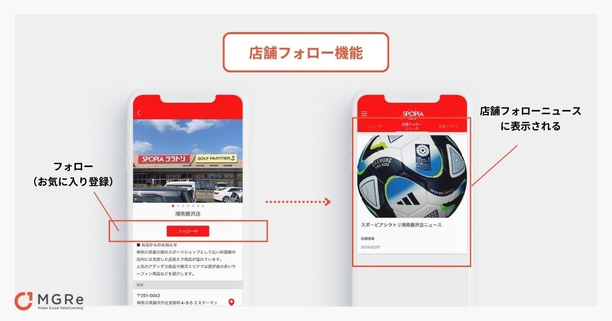 MGReの「店舗フォロー」機能*2では、ユーザーが好きな店舗やよく行く店舗をお気に入り登録が可能です。お気に入り登録された店舗のニュースは「店舗フォローニュース」タブに表示され、登録した店舗の新着情報やセール情報などを見逃すことなくキャッチできます。