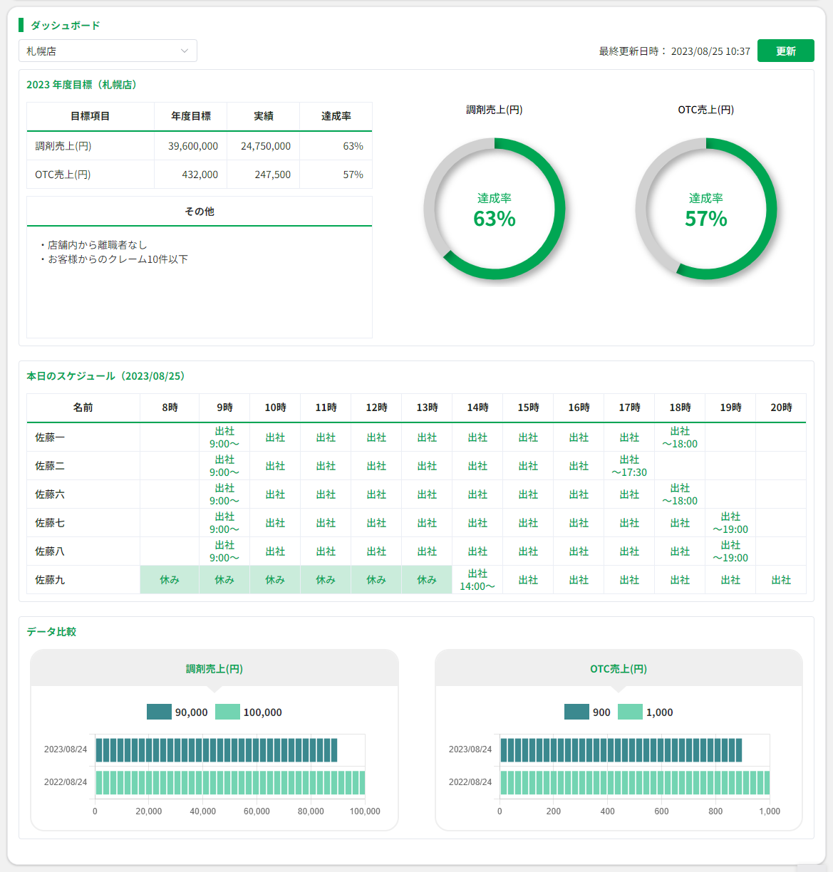 毎日確認していただきたい「年度目標(達成率)」 「前日の店舗数字(過去と比較)」 「本日のスケジュール」を表示します。