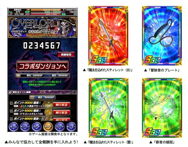 期間中、ゲーム内の特設ページに「協力ミッション」に関する数値が表示され、コラボスペシャルダンジョンに参加した全ユーザーのクリア回数に応じて、コラボ限定子分カード「冒険者のプレート」「叡者の額冠」「魔法を込めたスティレット(炎)」「魔法を込めたスティレット(雷)」やコラボ限定オーブ「冒険者ナーベオーブ」「クレマンティーヌオーブ」などが入手できます!たくさんダンジョンをクリアして豪華報酬をゲットしましょう!