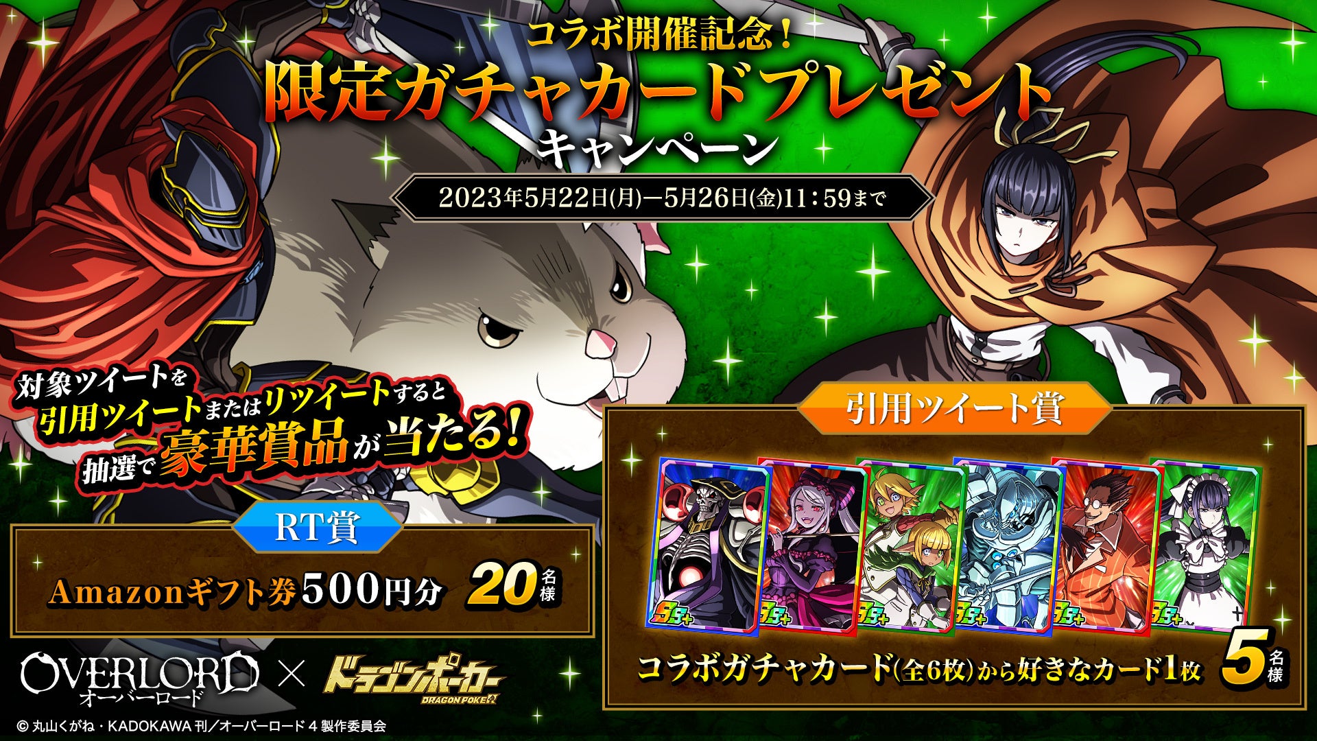 期間中、『ドラゴンポーカー』公式Twitterアカウント(@DragonPoker_aso)が投稿したキャンペーン対象ツイートに「#オバロドラポコラボ」をつけて引用ツイートしていただいた方の中から抽選で、“コラボガチャカード(全6枚)からお好きなカード1枚”をプレゼント!さらに、リツイートしていただいた方の中から抽選で“Amazonギフト券500円分”をプレゼント!ふるってご参加ください。