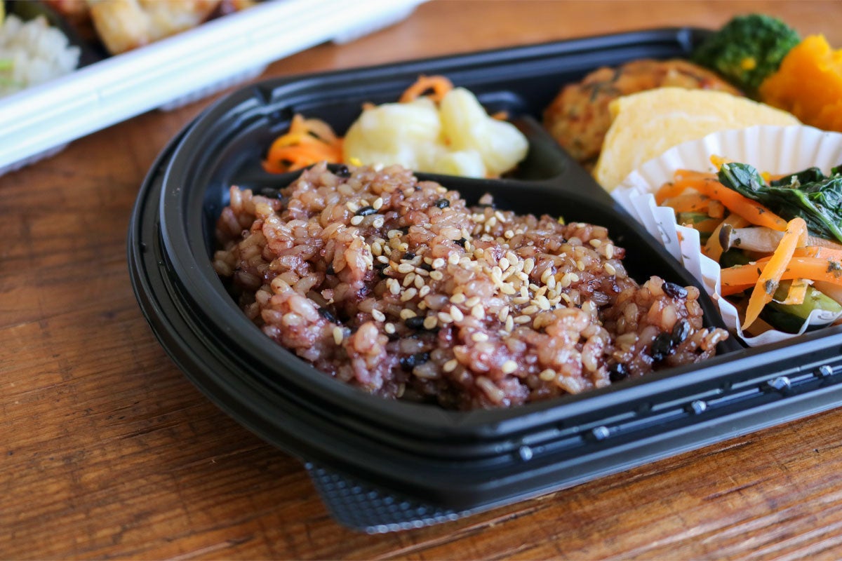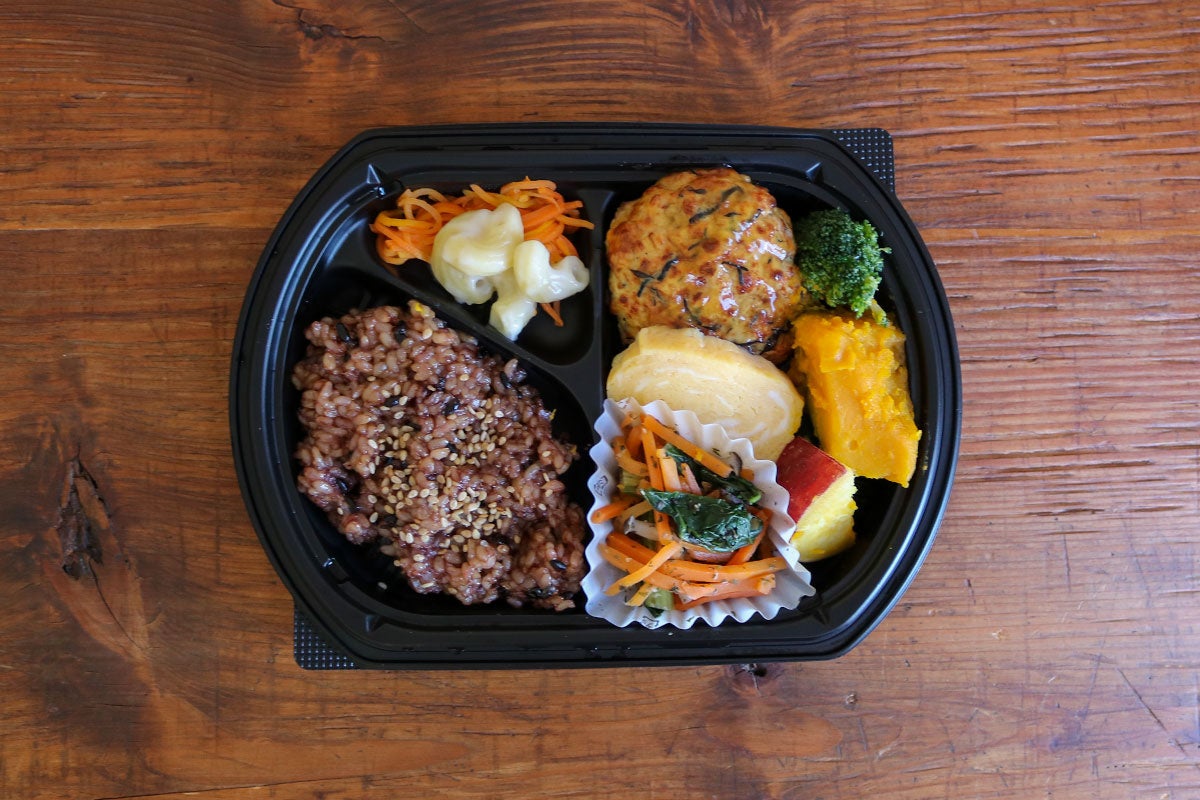 ごはんは国産の玄米と黒米を使用した「寝かせ玄米🄬」を使用。もっちもちの食感がまるでおこわのようで、噛むほどにコクと甘みを感じ、より満足感を高めてくれます。彩も豊かな多品目のおかずは、豆腐ハンバーグやさつまいも、人参と食物繊維が豊富な食材を使用しています。ふわふわの豆腐ハンバーグは、ヘルシーなのにたんぱく質が豊富。柔らかくさっぱりとしていて、とろみのあるタレが絡み優しい味に仕上げています。