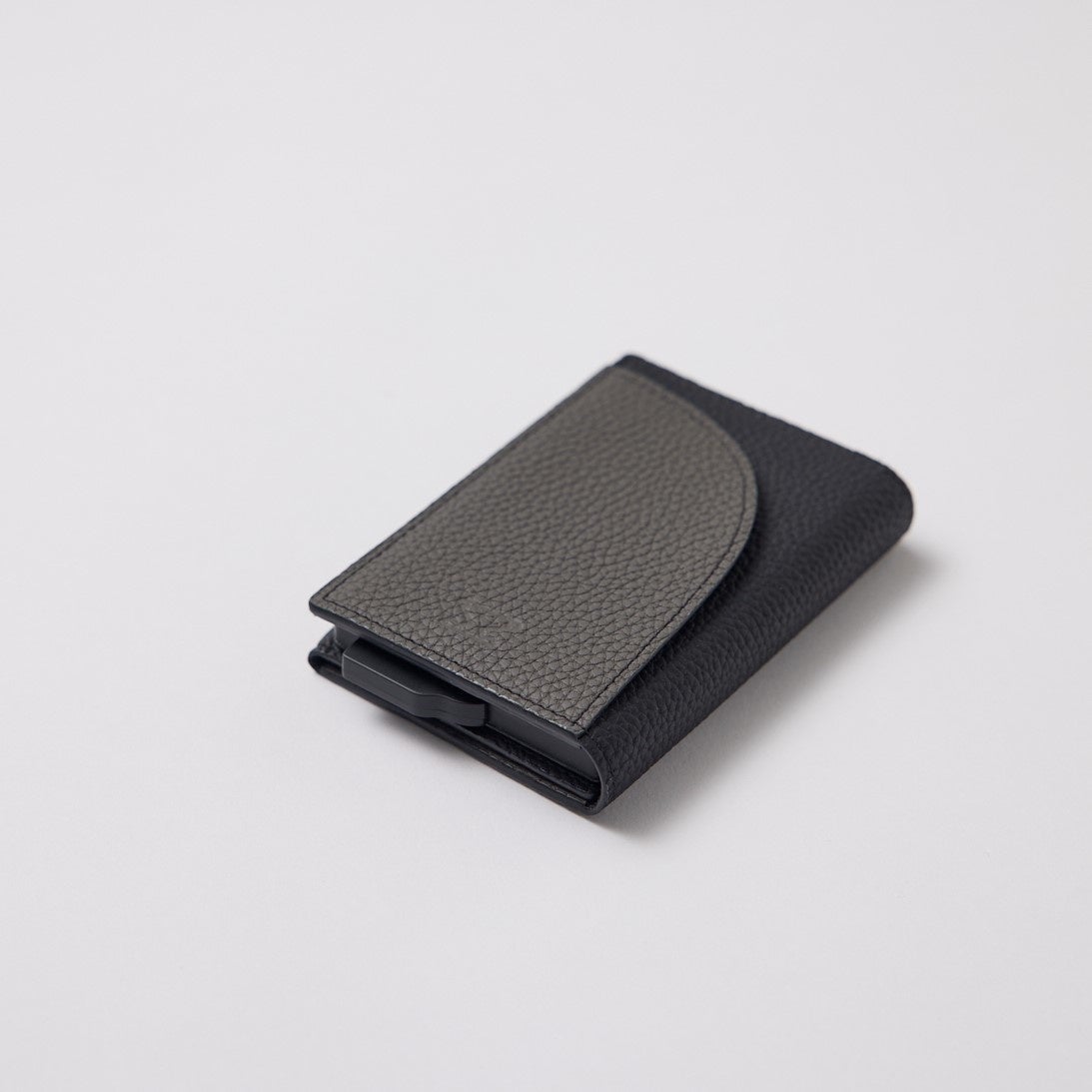 内側に収納されたメタルカードケースホルダーは、ボタンをスライドさせるだけでカードがポップアップし、ワンタッチでスムーズにカードを素早く取り出せます。しまうときは、上から直接カードを差し込むだけでレザーに負担をかけません。また、ケース内部にグリッドがあるので、カードが1枚だけでも落ちません。