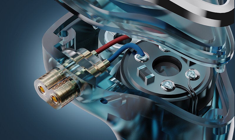 着脱式ケーブルのイヤホン側接合ベース部分を、旧来の別パーツとする構造からポリカーボネートシェルとの一体成形構造へ変更。これによりイヤホン使用中やケーブル交換時に接合部にかかるストレスが大幅に軽減され、製品の信頼性が大幅に向上しました。