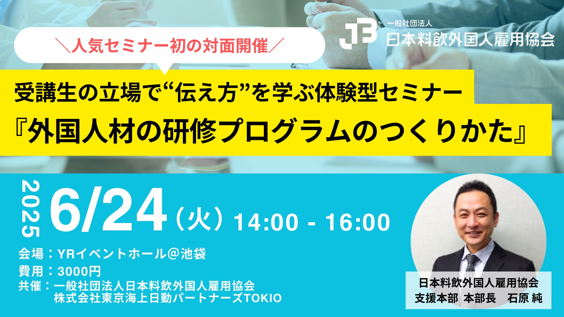 特定技能の“定着と活躍”を支える研修方法をレクチャー!実践型「研修プログラム設計セミナー」を6月24日に初開催@東京池袋(日本料飲外国人雇用協会)