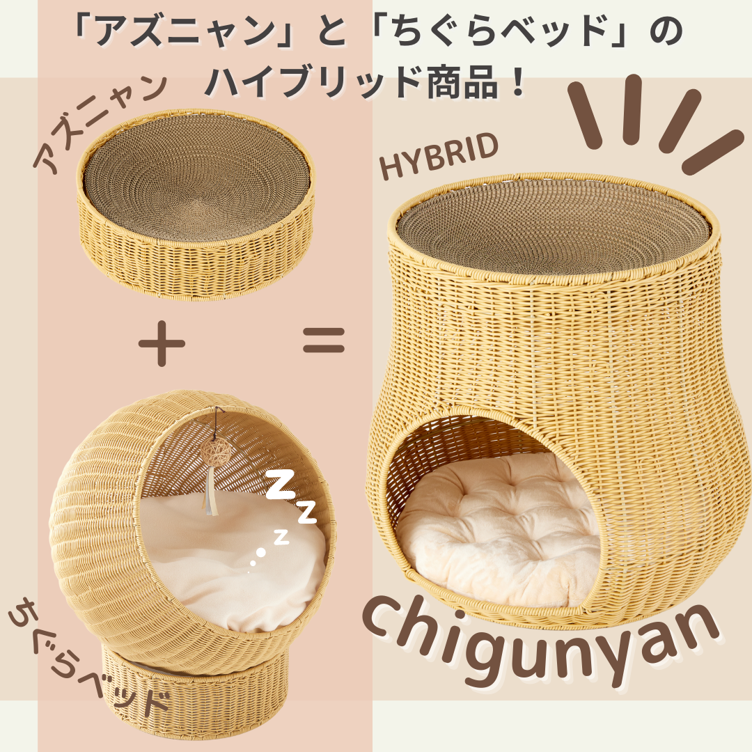 そこで、2WAY爪とぎベッド「アズニャン」と、リゾート気分満載の「ちぐらベッド」がひとつになった、その名も『ちぐニャン』が新開発!