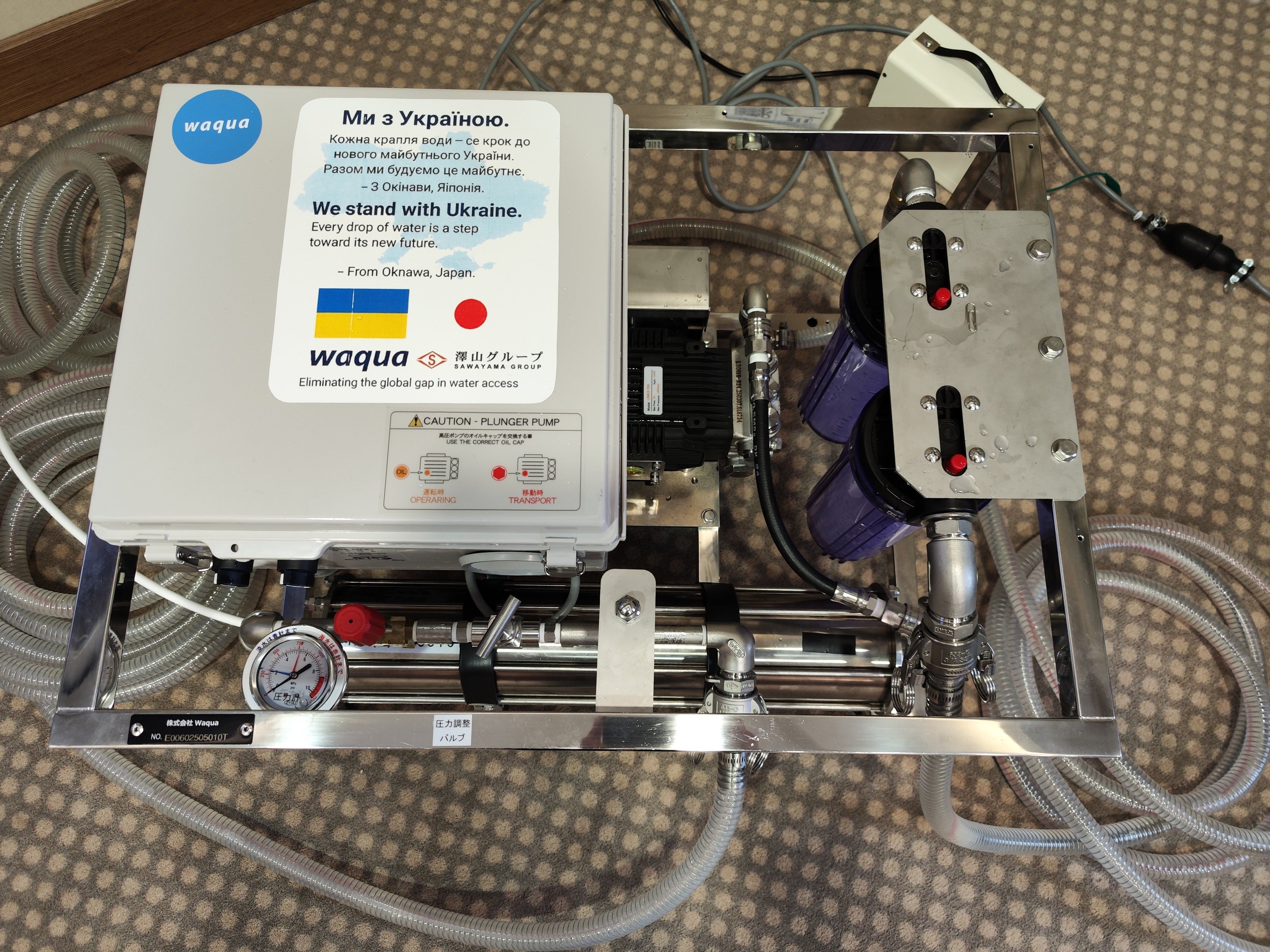 Sawayama Corporation(本社:長崎県長崎市、代表:澤山 精一郎)およびWaqua株式会社(本社:沖縄県うるま市、代表取締役CEO:松岡 徹)は、2025年10月29日、ウクライナ・キーウ市内のホテルにて、ブチャ市に所在する「Kyiv Regional Mental Health Center(キーウ地域メンタルヘルスセンター)」への可搬型海水淡水化装置「E-60」寄贈式を実施しました。