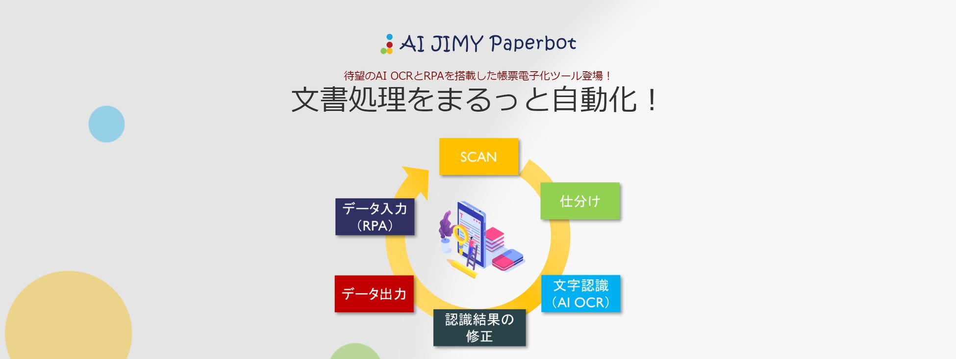 AI JIMY Paperbotはデータ入力業務や帳票電子化業務を自動化するためのツールで、手書き文字を含む紙のデジタル化がこのツールひとつで完結します。本ツールには、スキャン機能や仕分け、AI OCRによる文字認識、認識結果の修正、PDFやCSVによるデータ出力、システムへのデータ入力が可能なRPA機能が搭載されています。