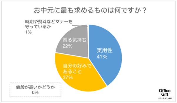 「お中元に最も求めるものは何ですか?」という質問では、「実用性」と「自分の好みであること」という回答が多く、贈る気持ちやマナーを重要視する人は意外にも少ないことがわかりました。