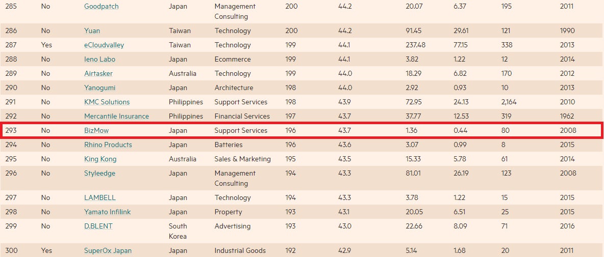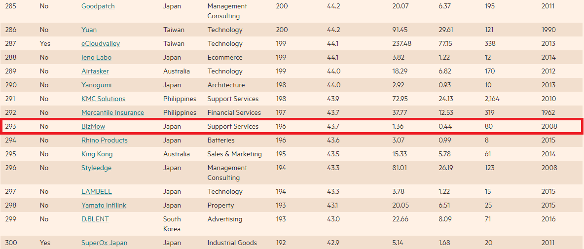 オンライン事務・経理代行サービスを提供しておりますBizMow株式会社(本社:東京都世田谷区・代表取締役:木村仁哉)は、英Financial Times(フィナンシャル・タイムズ)紙と独Statista(スタティスタ)社が共同で実施した「High Growth Companies Asia-Pacific 2022(アジア太平洋地域における急成長企業ランキング2022)」において、500社中、293位にランクインしたことをお知らせいたします。