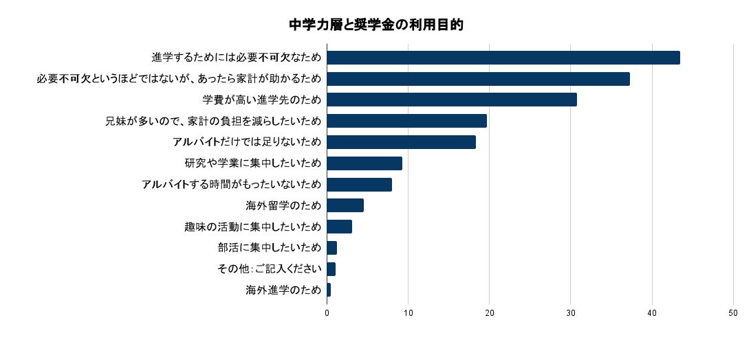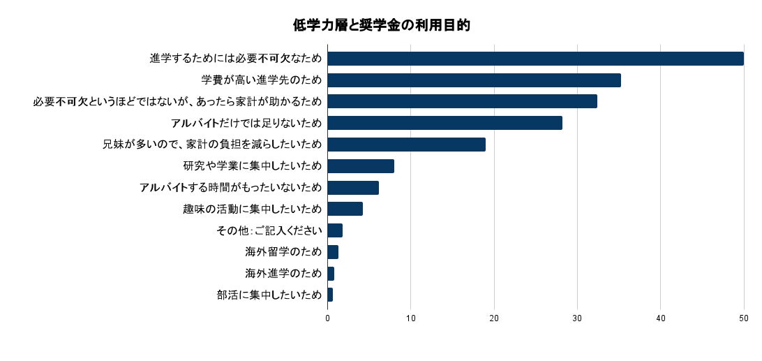 低学力層は、多い順に「進学するには必要不可欠なため」が最多で半数の50%、続いて「学費が高い進学先のため」35.2%、「必要不可欠というほどではないがあったら家計が助かるため」32.4%と続きます。