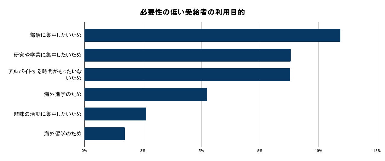 6. 奨学金の必要性が低い受給者の利用目的は、「部活に集中したいため」10.9%、「研究や学業に集中したいため」8.8%、「アルバイトする時間がもったいないため」8.8%、「海外進学のため」5.5%、「趣味の活動に専念したいため」2.6%、「海外留学のため」1.7%と学費以外を目的に利用している学生も多く存在しており、学生生活を有意義に過ごすために積極的に奨学金を活用している。