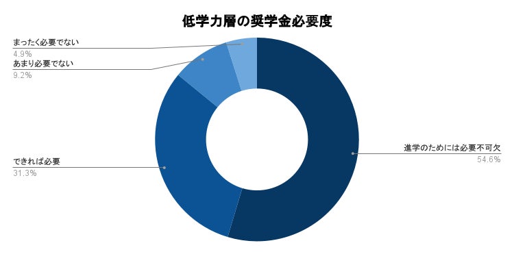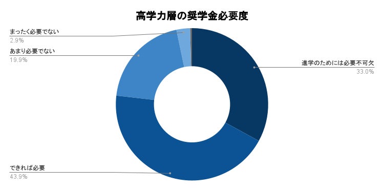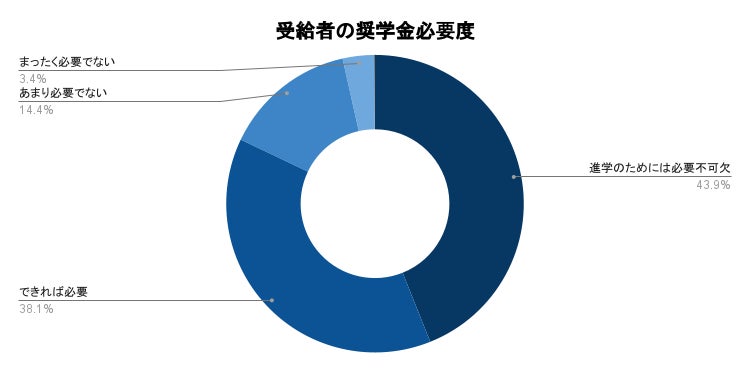 一方で、「あまり必要でない」(14.4%)、「まったく必要でない」(3.4%)という層は合わせて17.8%おり、約5人にひとりは奨学金受給の必要性の低い学生および保護者であることが分かりました。