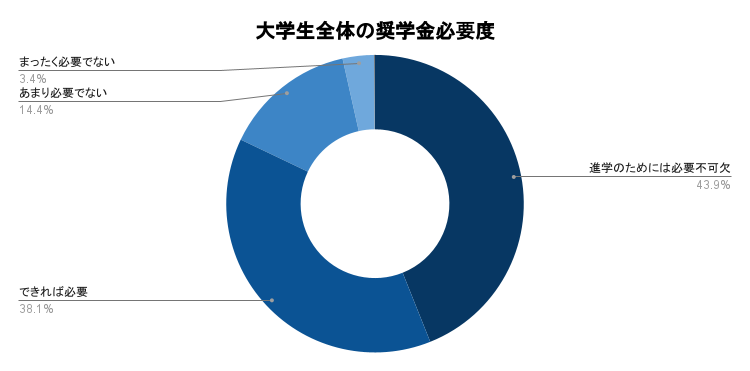 奨学金の必要度は、「必要不可欠」が最も多く43.9%、続いて「できれば必要」が38.1%。