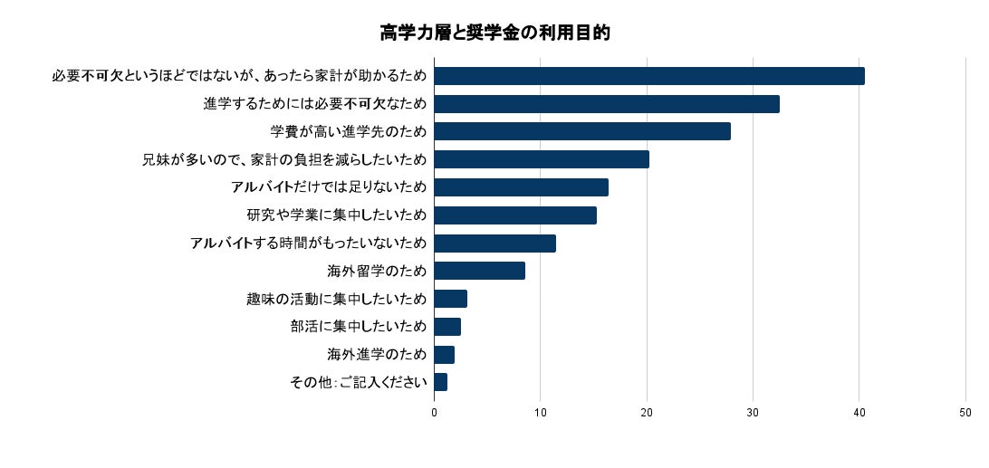 高学力層においては、「研究や学業に集中したいため」15.3%、「アルバイトする時間がもったいないため」11.5%、「海外留学のため」8.5%、「趣味の活動に専念したいため」3.1%、「部活に集中したいため」2.5%、「海外進学のため」1.9%、といった学費以外の理由も多くを占め、高学力層において、金銭的な理由以外が42.7%と半数近い回答を占める結果となりました。