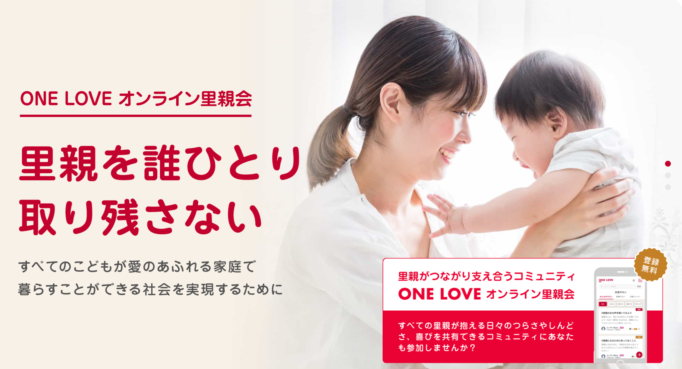養育里親が1年未満で約25%がギブアップしてしまう状況を鑑み、2020年1月に約764万円のクラウドファンディングの支援達成を受けて、ONE LOVEオンライン里親会を開始。2023年3月現在、約750名の里親会員が加入している。里親同士で養育に関する悩みを共有し合うオンライン里親会、有識者を招いて養育に役立つ情報が学べる里親オンラインセミナー、里親が養育に必要な情報を体系的に学べる里親ガイドブック等の運営を行っており、これら全ての里親支援を里親等が無料で受けられるよう寄付者を募っており、これまでに2,000名を超える寄付者からの支援を受けている一方で、オンライン里親会は過去100回以上開催され、累計1,000人以上の里親等が参加している。「オンライン里親がなければ、里親を辞めていた」「私にとっての心の拠り所となっています」「あ〜里親さんと話したいなと思った時に、本当の思いを話せる(放せる)ので本当にありがたいです」といった声が寄せられている。