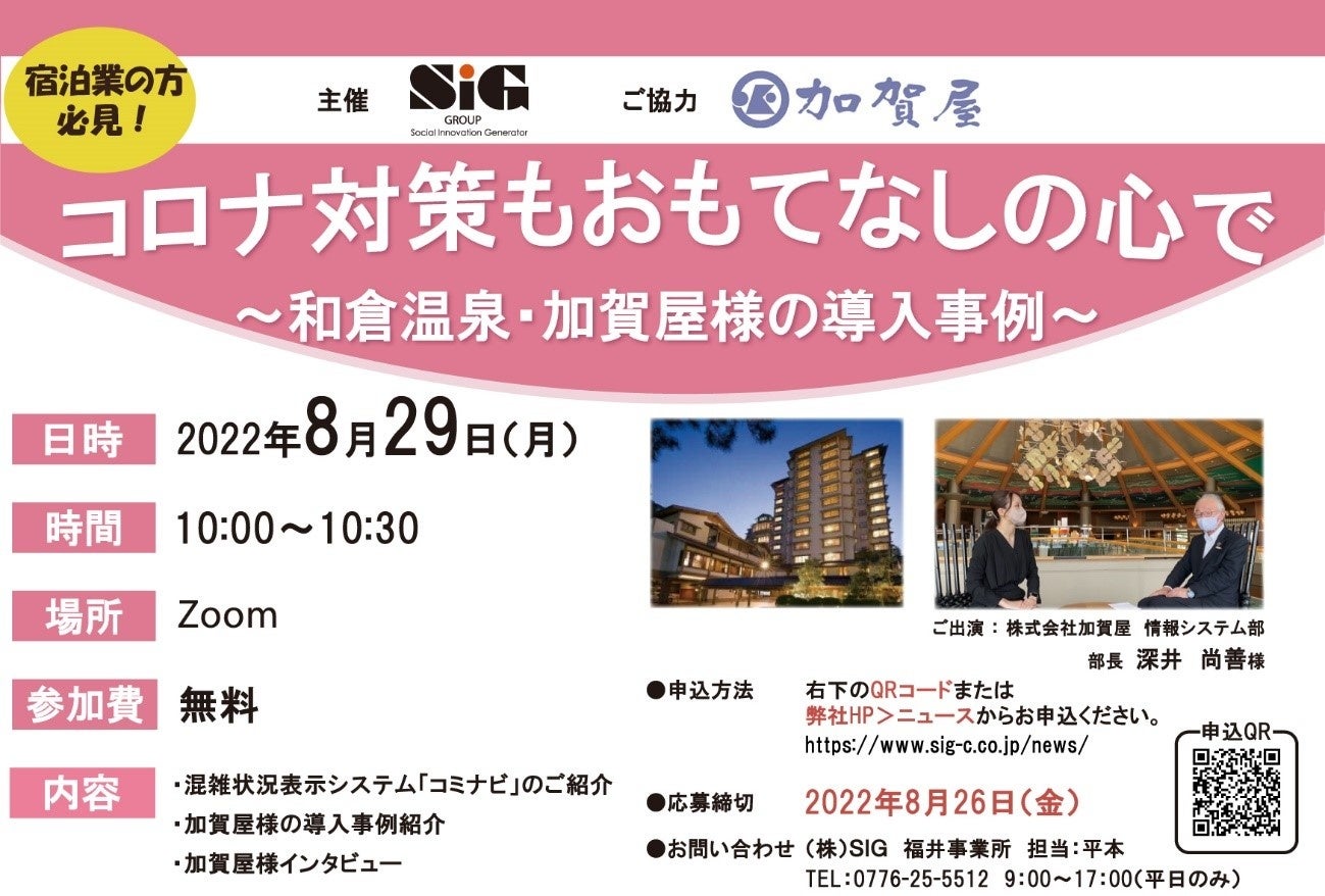 システム開発やITインフラソリューション構築を中心に、クラウドソリューションや、ネットワークシステムの構築・保守・運用におけるサービスを提供する株式会社SIG(本社:東京都千代田区、代表取締役社長:石川純生、株式会社SIGグループ100%子会社)は、8月29日(月)10時より、無料オンラインセミナー「コロナ対策もおもてなしの心で ~和倉温泉・加賀屋様の導入事例~」を開催します。