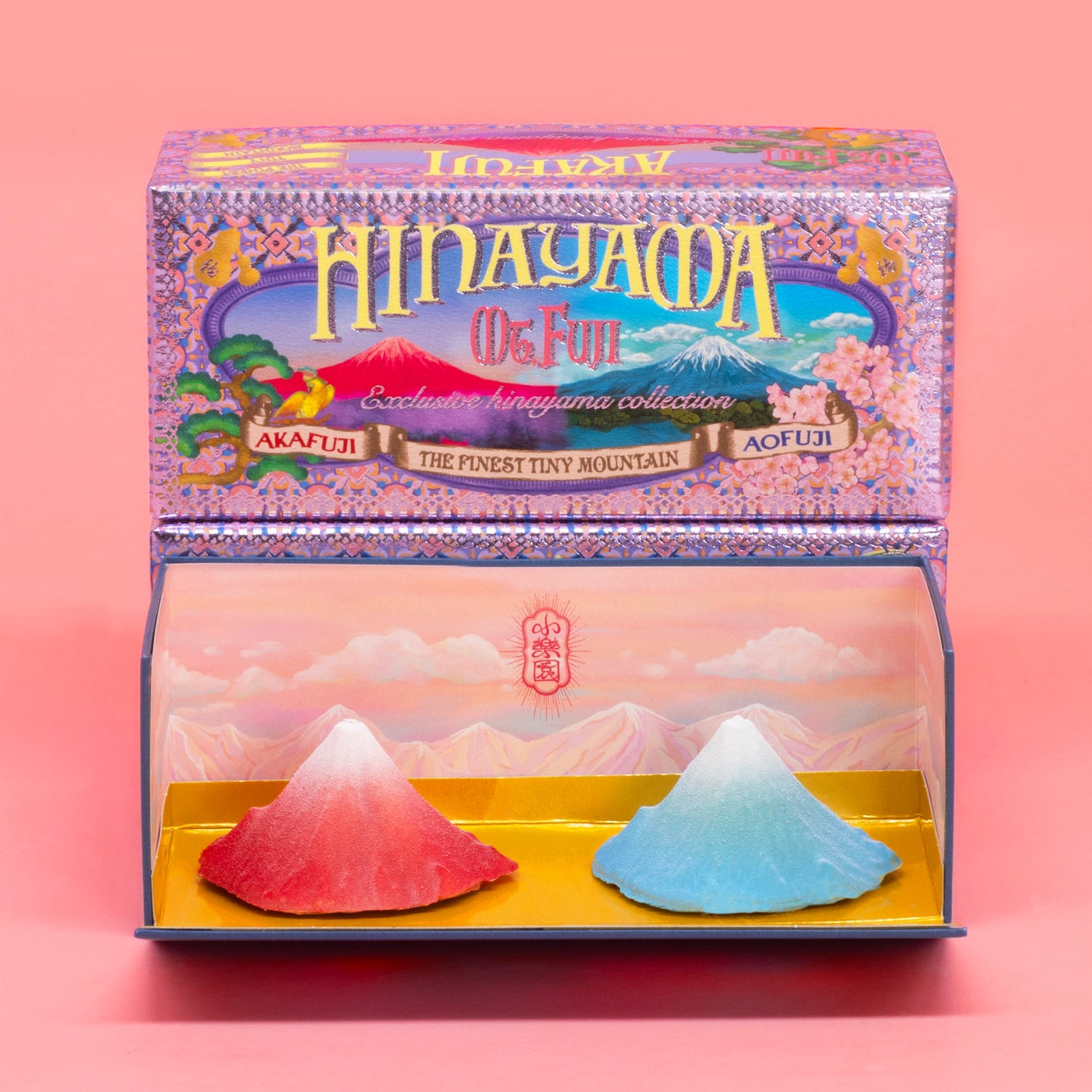日本の最高峰を指のせサイズにした雛山富士山。晴れやかな空の下の「青富士」と、数多の偶然が重なって出逢える縁起の良い冠雪の「赤富士」の 2 個セットでご用意いたします。