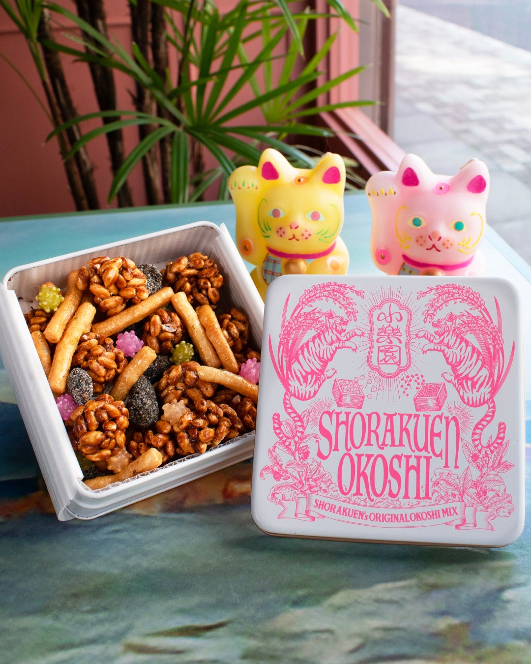 小楽園キッチンで丁寧にひとつひとつ制作している、オリジナルのおこしが入ったお菓子缶です。みたらし風味で甘しょっぱいカリカリが癖になる「小楽園のおこし」と、黒胡麻をまぶした香ばしい 3 種 のキャラメリゼナッツ。柚子胡椒風味のかりんとうに梅とニッキと抹茶の味の金平糖を詰め合わせました。