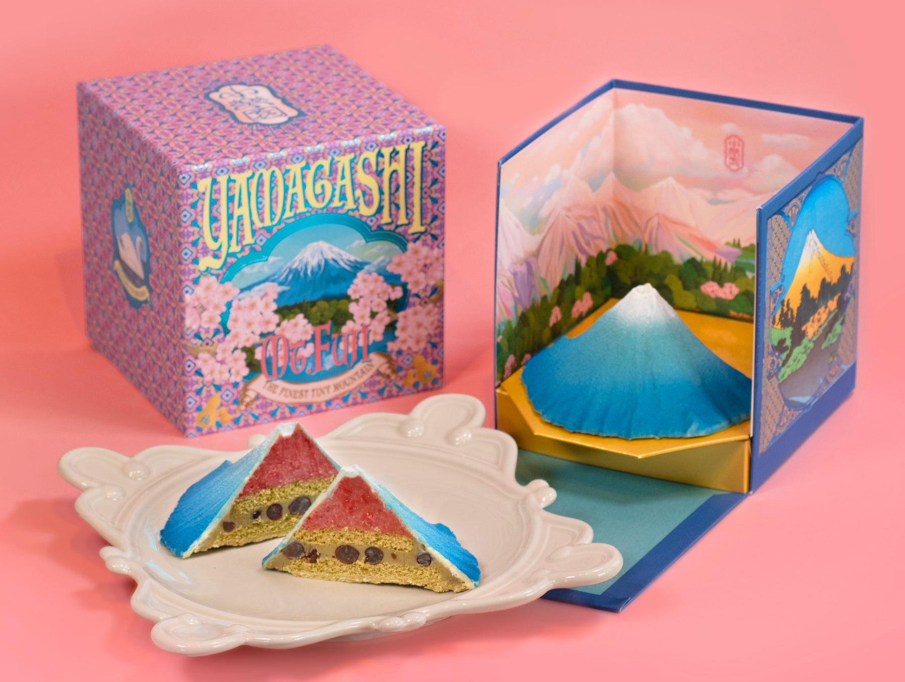 チョコレートのシェルでできた山肌を崩すと、山頂付近にはガナッシュ、中段には小豆とスポンジケーキ、下段はフィアンティーヌが入ったさくさくした食感のチョコレート。まるで地層のように重なったレイヤーケーキとなっており、きれいに切り分けても、力強く崩しても、自然物らしい姿となり面白い。食べる前だけでなく、食べている途中の崩れたヴィジュアルまで楽しめる新しいお菓子です。それぞれの山にはその地方の特産物を使用しており、その山らしい味と季節をイメージした味わいになっています。