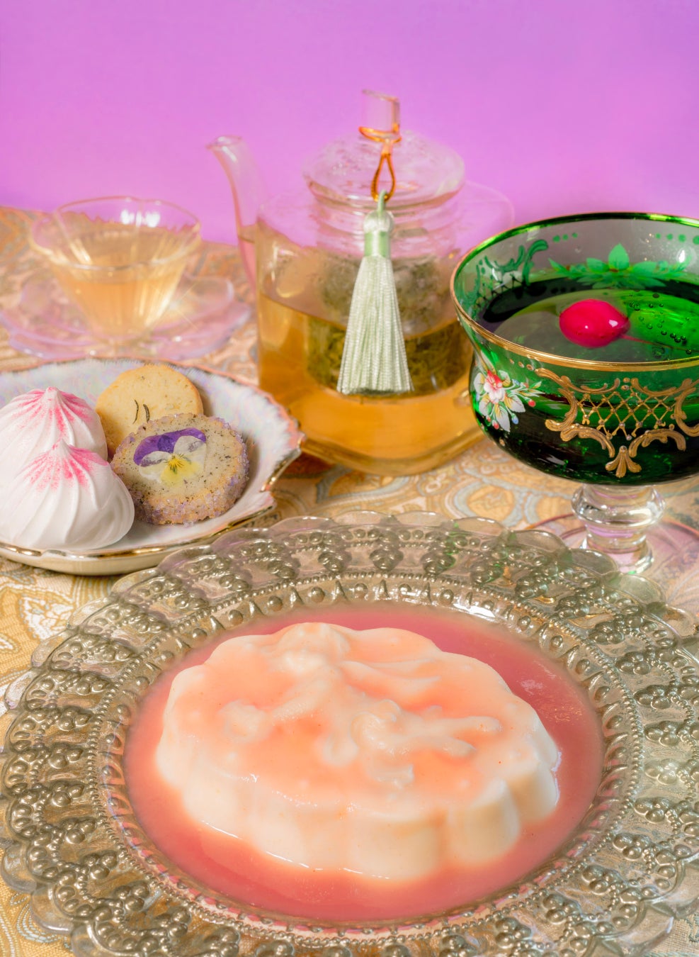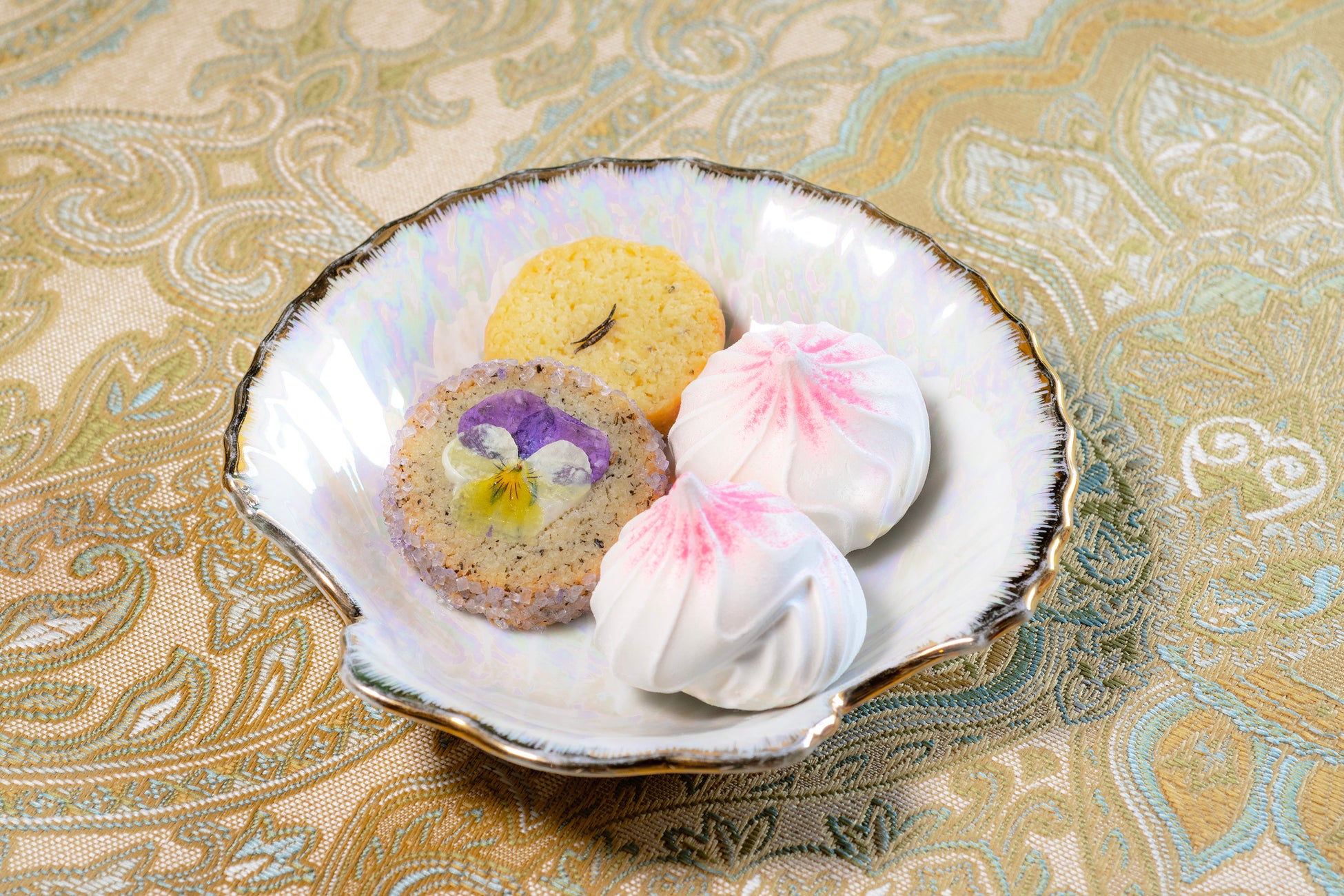 小楽園のキッチンで焼き上げるクッキーは、ジャスミン茶がふんわり香る、すみれ色のざらめを纏ったクッキーと、スパークリングワインにも合うローズマリーとチーズのクッキーの2種。まるで天使の頬のようなぷっくりとしたバニラメレンゲと一緒にどうぞ。
