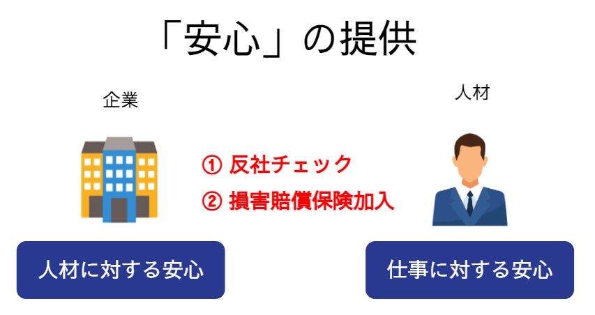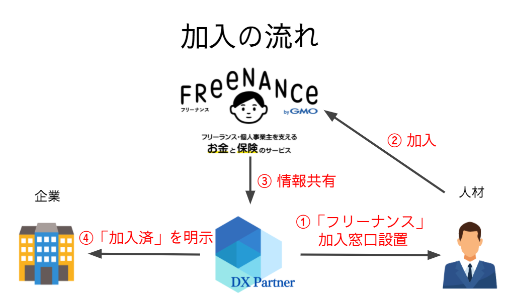 フリーランス向け金融支援サービス「FREENANCE byGMO」と連携し、DXパートナーを利用する副業・兼業人材に対する「反社チェック」「損害賠償保険(無料)への加入」などを実現することで、企業と人材双方がより「安心」してご利用いただくための環境を提供します。