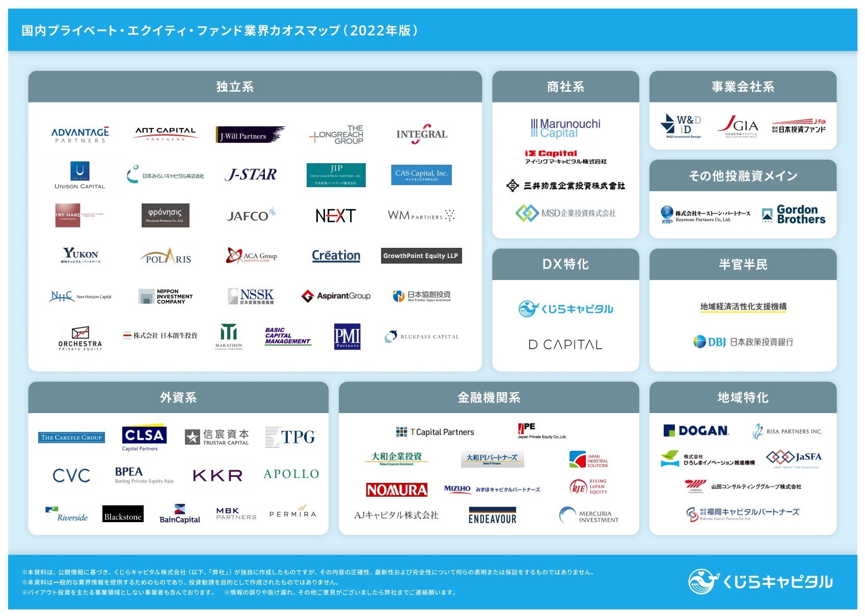 くじらキャピタルは、 国内PEファンド業界における主要プレイヤーとそのファンド規模をまとめたカオスマップ2022年版を作成しました。