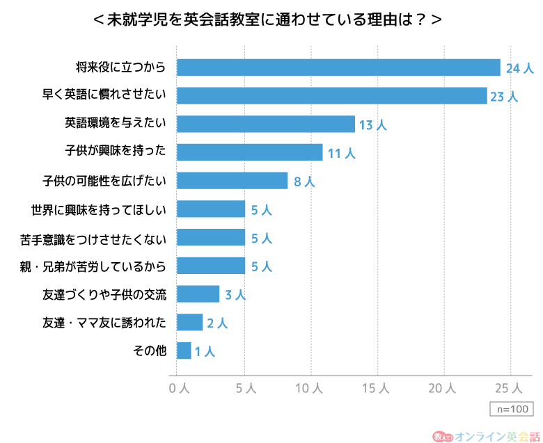 未就学児を英会話教室に通わせている理由を聞いたところ、「将来の役に経つから」と回答した方が100人中24人で最も多く、1票差で「早く英語に慣れさせたい」という意見が多い結果となりました。