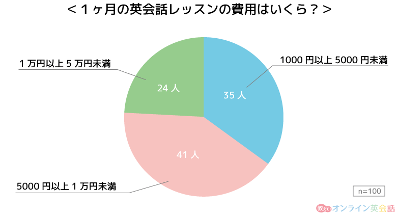 アンケート調査の結果、「1ヶ月の英会話レッスンの費用は5000円以上1万円未満」と回答した方が100人中41人で最も多かったです。
