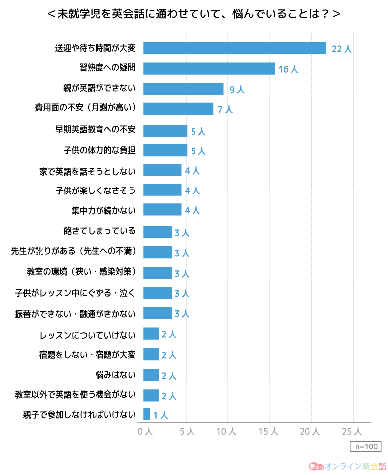 アンケート調査にて、「未就学児を英会話に通わせていて、悩んでいることは何ですか?」と聞いてみたところ、「送迎や待ち時間が大変」という意見が最も多かったです。