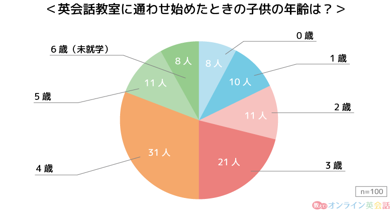 最も多かった回答は4歳(100人中31人)で、次に多かったのは3歳(100人中21人)でした。子供が3歳~4歳のときに通わせ始めた人が、全体の約半数となっています。