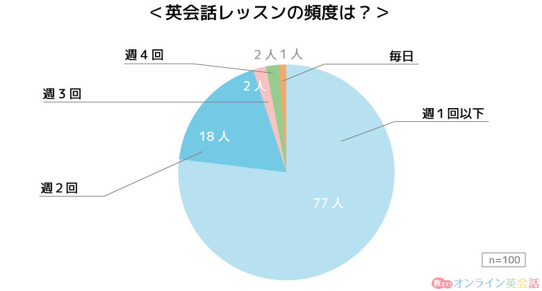 ちなみに英会話レッスンを受講する頻度を聞いたところ、77人が「週一回以下」と回答しました。