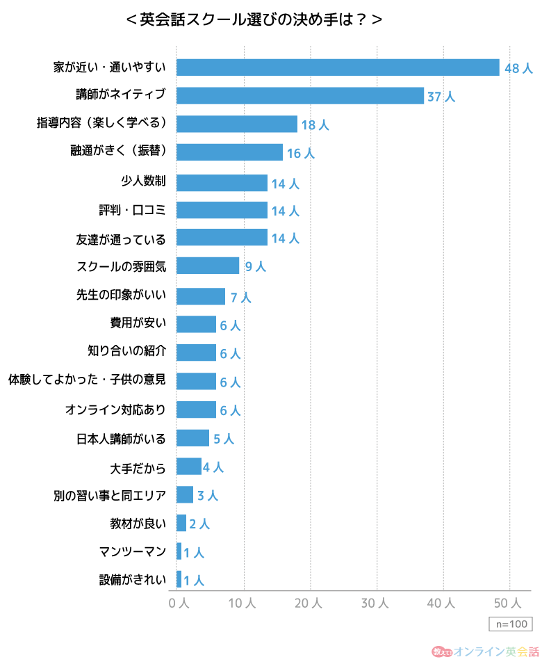 - 英会話教室選びの決め手は「家から近い・通いやすい」
