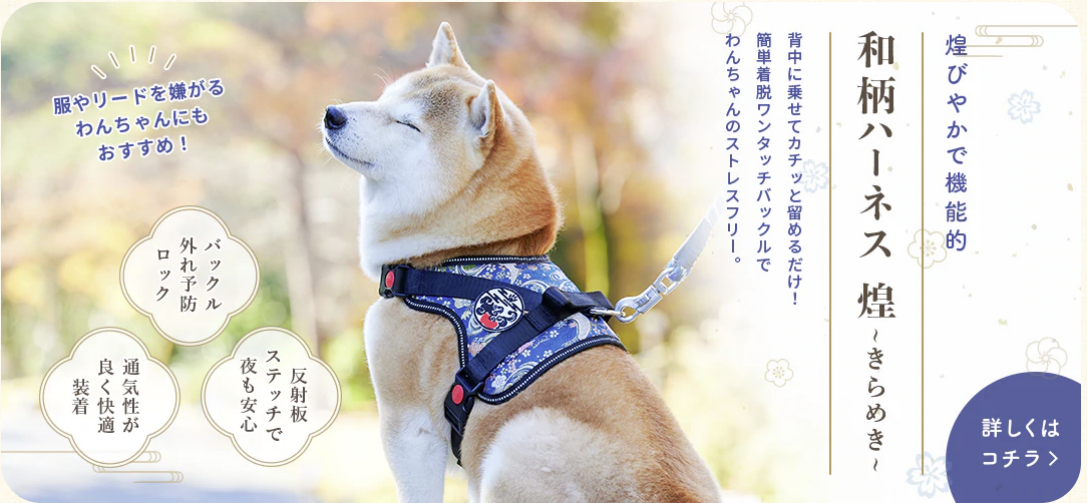 そんな想いで、京都の西陣金襴織を使った ”煌ハーネス”を自社開発。