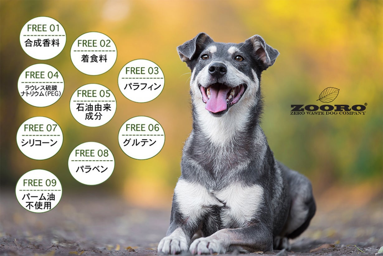 自然由来のシンプルな処方にこだわり、香水、合成香料、着色料、ラウレス硫酸ナトリウム(PEG:界面活性剤の一種)、パラフィン、石油由来成分、パラベン、シリコーン、グルテン、パーム油の9つのフリー(不使用)を実現しました。肌トラブルがある犬猫たちにやさしいケア用品です。