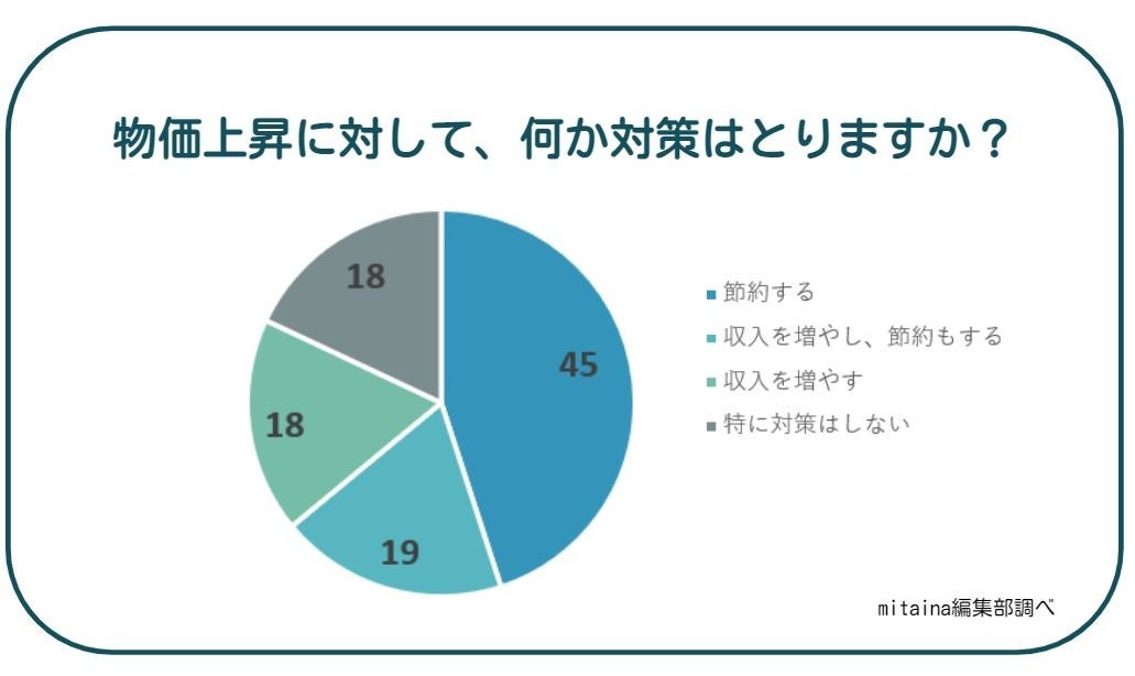 一方で「特に対策はしない」と回答した方は18%でした。物価上昇の実感がない、または日々の暮らしへの影響はそれ程大きくないと考えている方も少数ですが、一定数いるようです。